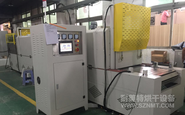 烘干部分總長4800mm,前后配自動提升門,緩沖區兩端各長300mm,冷卻區長1200mm, 進料部分長600mm,出料部分升降接駁臺長700mm ;